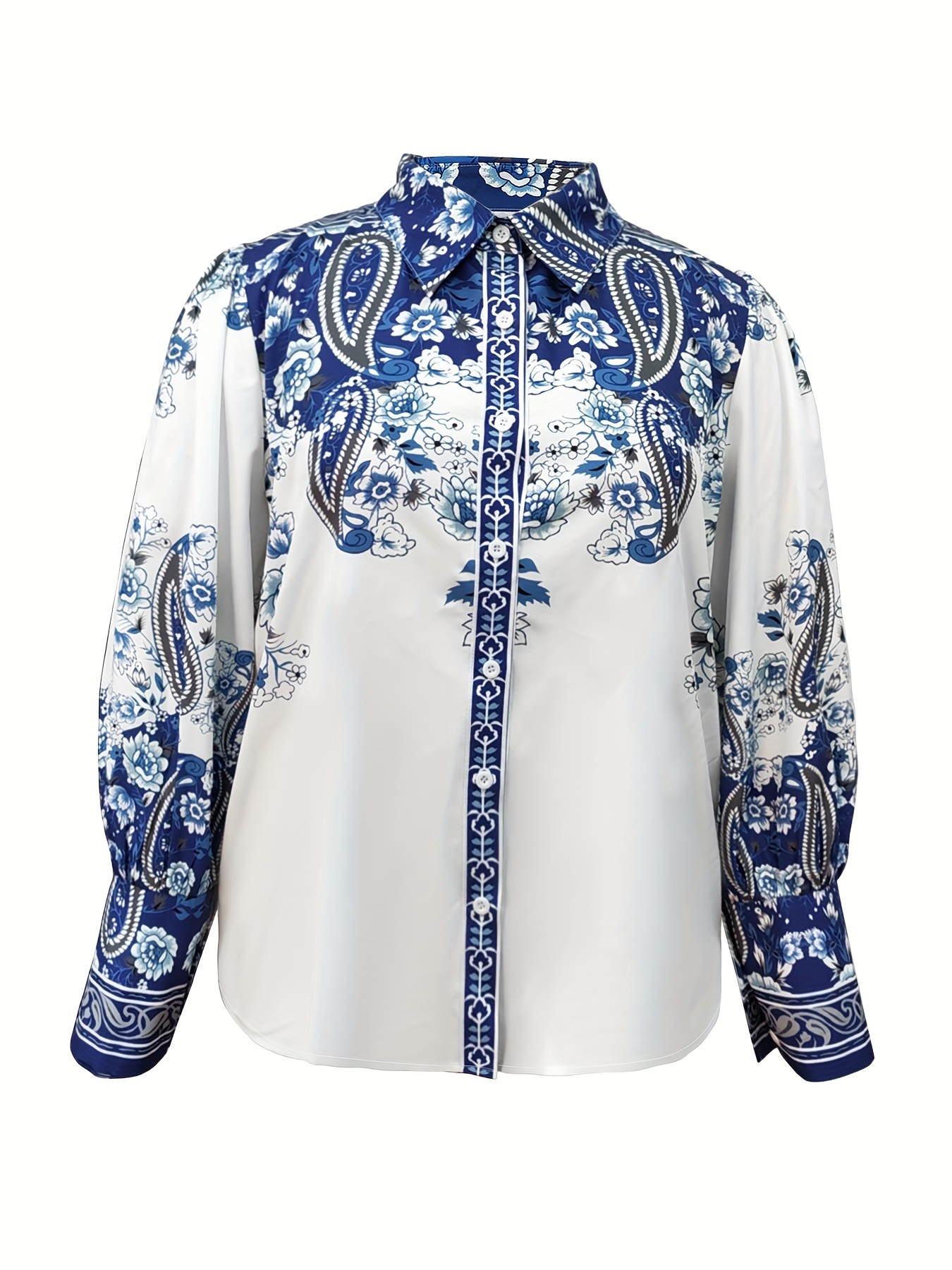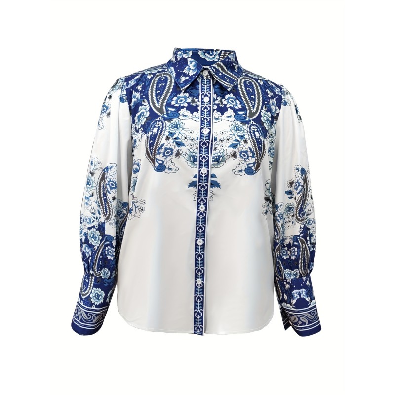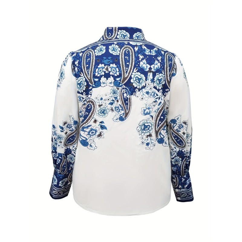 Plus Size Floral Print Blouse - Casual Lapel Long Sleeve Shirt - Polyester & Spandex Blend with Slight Stretch, Button Detail, Regular Length - Oversized Style for Going Out, All Seasons, Woven H-Fit - Middle East Collection