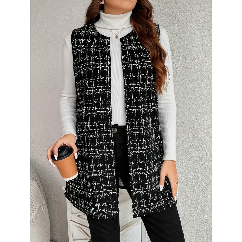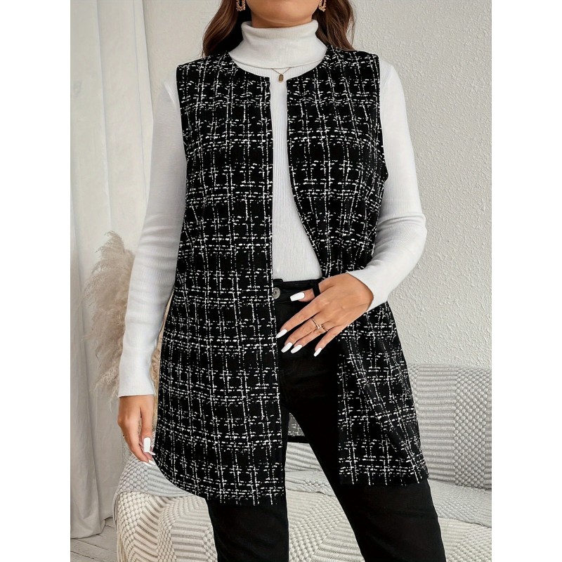 Plus Size Plaid Pattern Vest Elegant Open Front Sleeveless Vest For Spring & Fall, Women's Plus Size Clothing